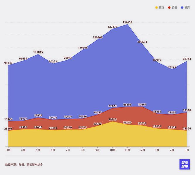 唯有比亚迪的王朝、海洋系列月销量冲突10万台。吉祥星河照旧领路成长为比亚迪的挑战者,在一季度的平均销量接近8万台,延续拉近与比亚迪的差距。不外这三个品牌同比王人出现了两位数下滑。
