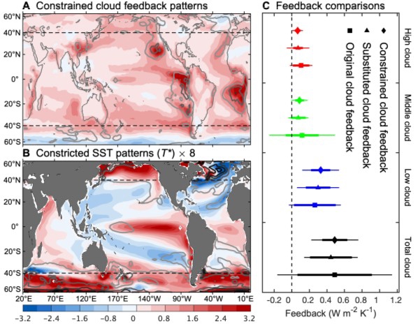 贬抑后的海表增暖型(B)和云放射反馈:(A)水瓜分手与(C)群众平均值