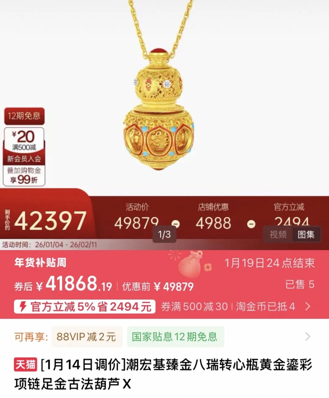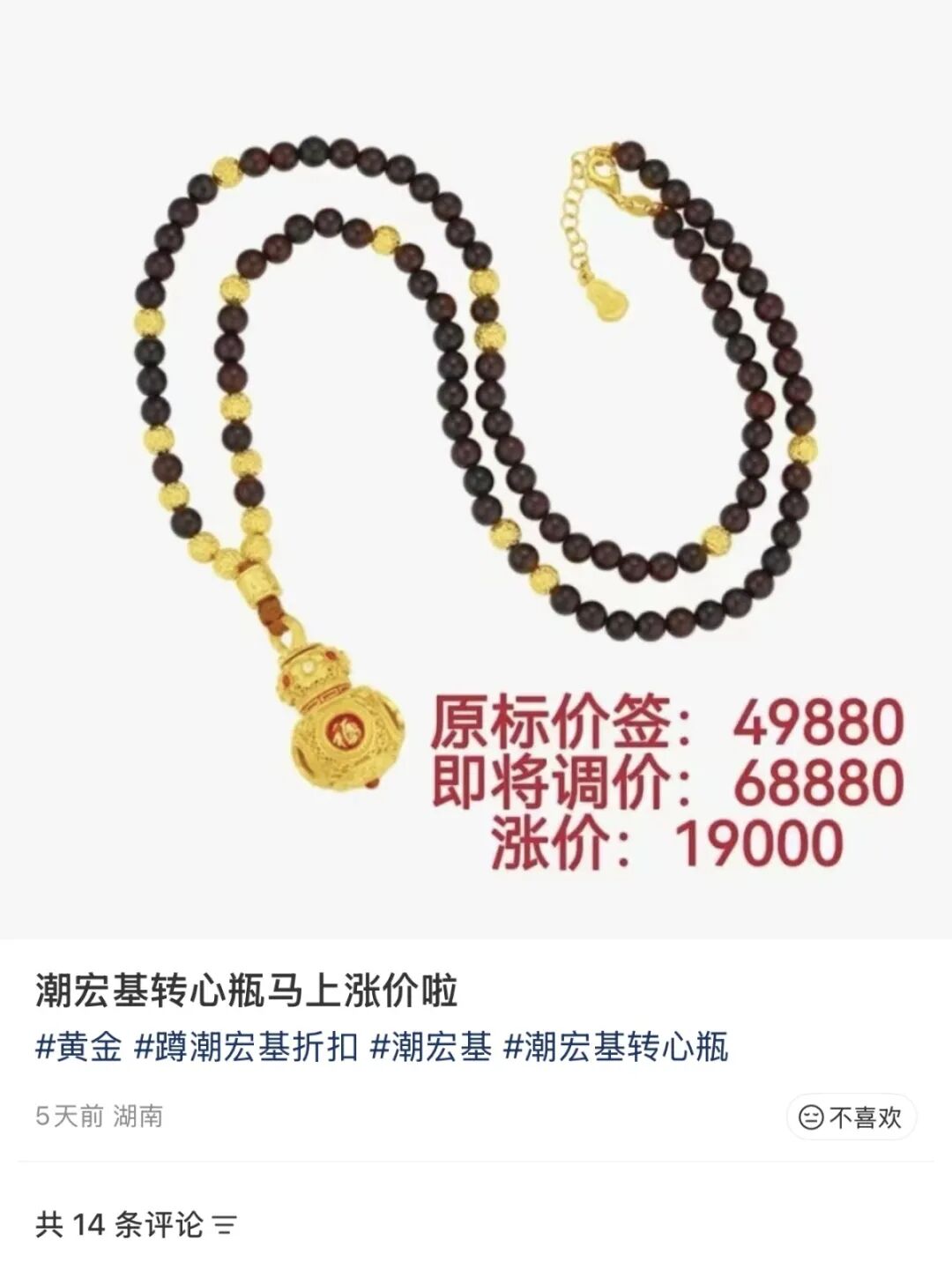 记者把稳到,昵称“潮宏基打工东说念主”的网友发布了多款居品的加价信息,称1月15日起品牌将对部分居品调价,潮宏基旗下爆款“转心瓶”项链从49880元涨至68880元,涨幅高达19000元。
