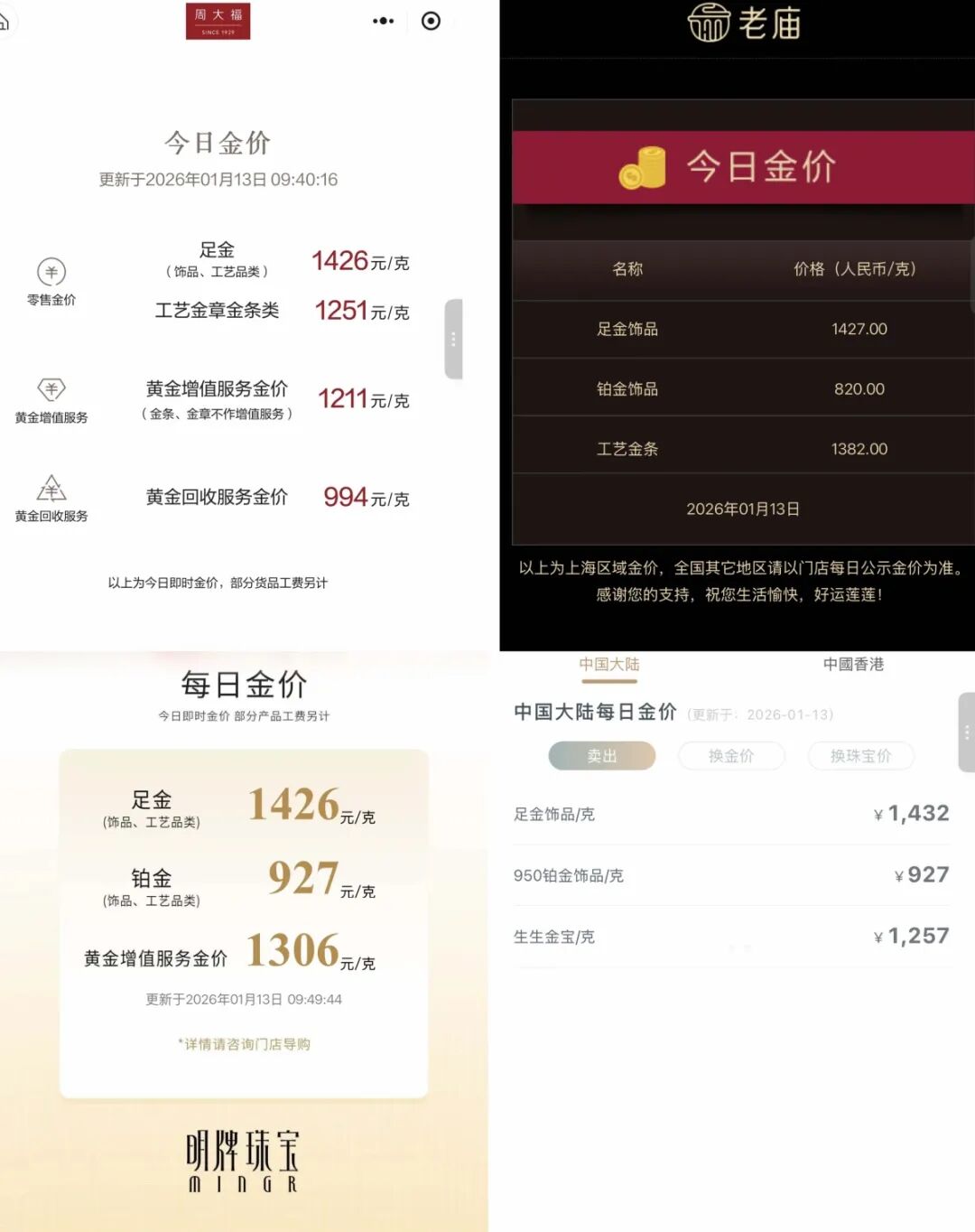 1月12日早盘,贵金属价钱狂飙,现货黄金盘中残害4600好意思元/盎司。记者查询看到,当今,国内多个黄金品牌及时报价均已跨越1400元/克。