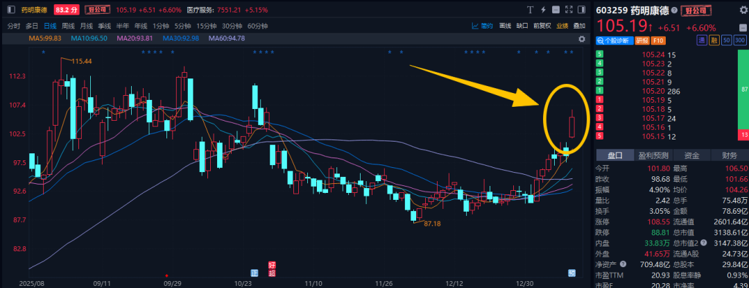 本日在买卖航天等热门巨量不对、指数全体回调下,功绩超预期的药明康德跳空高开逆市大涨!