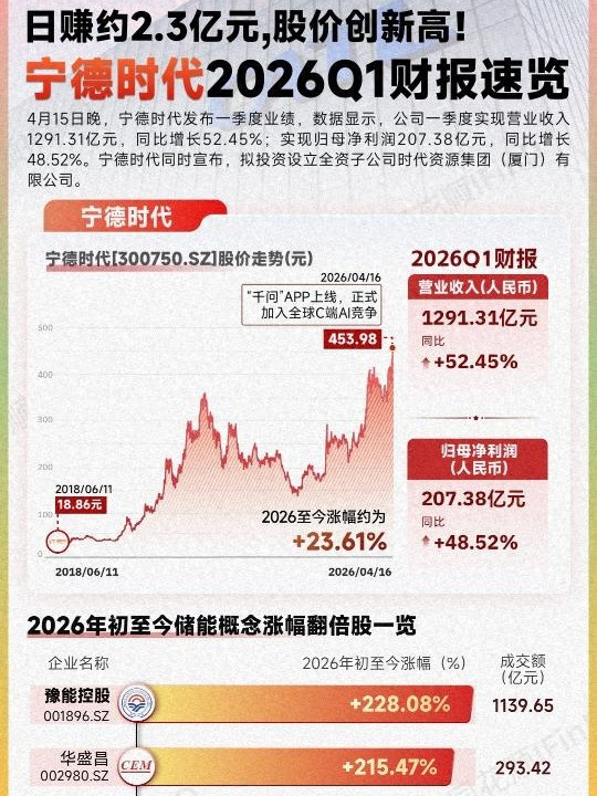 营收与利润高增:2026年第一季度实现营业收入1291.31亿元,同比增长52.45%;归母净利润207.38亿元,同比增长48.52%,日均盈利约2.3亿元,功绩增长权贵。这一增速远超行业平均水平,突显其在天下能源电板界限的龙头地位。