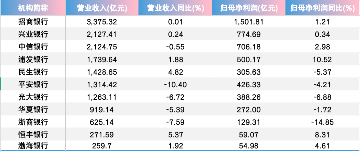 其余股份行中,招商银行、兴业银行、中信银行归母净利润均扫尾了3%以下的小幅增长。