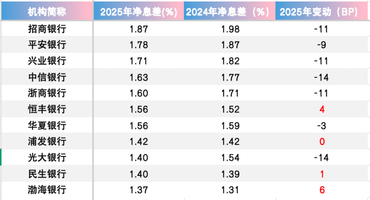 扶助股份行利息净收入举座好转的要素之一是净息差降幅收窄。11家股份行中,有3家(恒丰银行、民生银行、渤海银行)净息差逆势回升,1家(浦发银行)捏平,其余7家下跌。而2024年这11家股份行中,有10家都出现了下跌。金融监管总局发布的数据也深化,2025年末,股份行净息差平均为1.56%,降幅5BP,而2024年末降幅则为15BP。