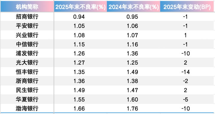 3家股份行不良贷款率出现了回升。其中,民生银行不良贷款率从2024年末的1.47%上涨2BP至1.49%。财报深化,客岁末,该行公司类贷款不良率为1.24%,比上年末下跌2BP;个东说念主贷款不良率为1.92%,比上年末上涨12BP。个东说念主类贷款中,信用卡透支不良贷款率有所上涨,由3.28%上涨59BP点至3.87%;小微贷款不良率由1.54%上涨9BP至1.63%;住房贷款不良率则扫尾了下跌,从0.96%降至0.77%。