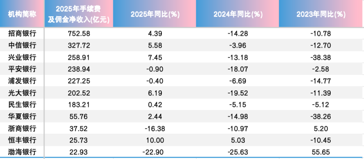 值得一提的是,与此前比较,2025年股份行手续费及佣金净收入举座呈现好转态势。2024年,11家股份行中,除恒丰银行手续费及佣金净收入同比增长外,其余10家无一例外全部属滑,且有7家降幅高出1成。