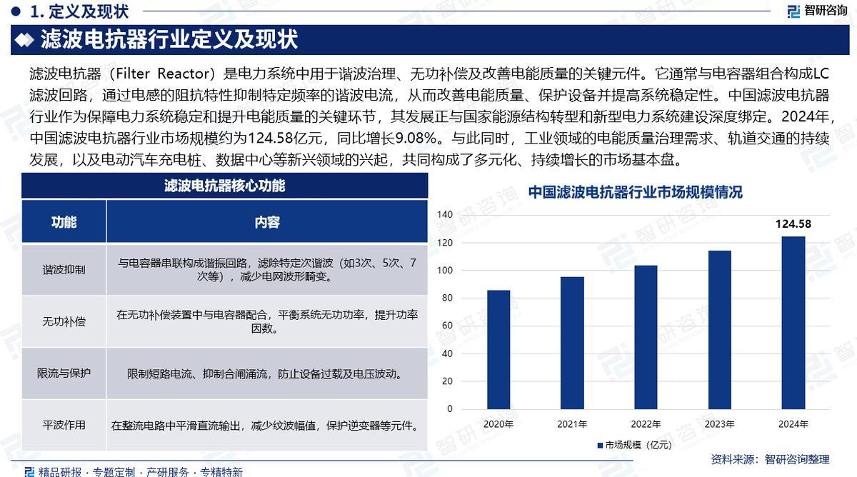 滤波电抗器(Filter Reactor)是电力系统顶用于谐波料理、无功赔偿及改善电能质地的要津元件。它往往与电容器组合组成LC滤波回路,通过电感的阻抗特点阻拦特定频率的谐波电流,从而改善电能质地、保护开采并提高系统踏实性。中国滤波电抗器行业行为电力系统踏实与电能质地晋升的中枢法子,深度绑定国度动力转型与新式电力系统成立。2024年,中国滤波电抗器行业市集边界达124.58亿元,同比增长9.08%。竞争步地呈“双寡头主导、专科细分、长尾并存”特征,特变电工、中国西电等头部企业通过手艺冲破主导高端市集。