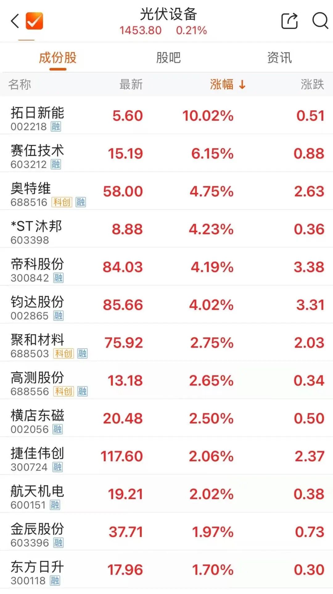光伏开拓板块异动,拓日新能2连板,九游app赛伍时间涨超6%,盘中一度涉及涨停。帝科股份、钧达股份、东方日升、双良节能等跟涨。