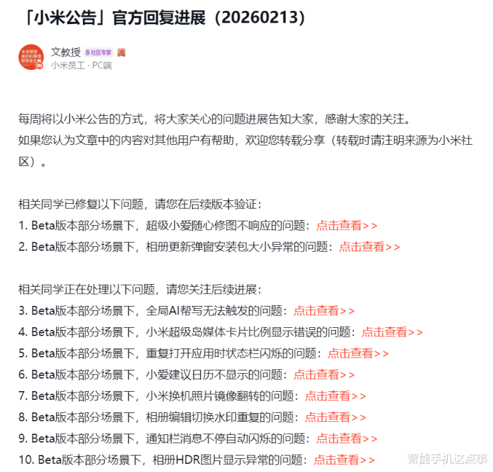 比如2026年2月13日小米官方再次发布了滂沱OS的最新施展公告,此次的要点十分明确,死磕Beta版的细节时弊。