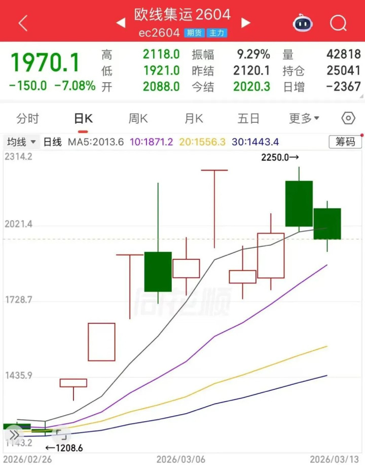{jz:field.toptypename/}本周,集运指数(欧线)期货(下称EC)市集波动加重。周一,EC近月合约一度涨停,周二大幅回落,随后大幅波动。本周五,EC主力合约收跌7.08%,至1970.1点。多位业内东说念主士暗意,在地缘风险、资本上升与淡季基本面之间的多重博弈下,刻下集运市集呈现出显然的多空拉锯情状,短期波动率可能难以下降。